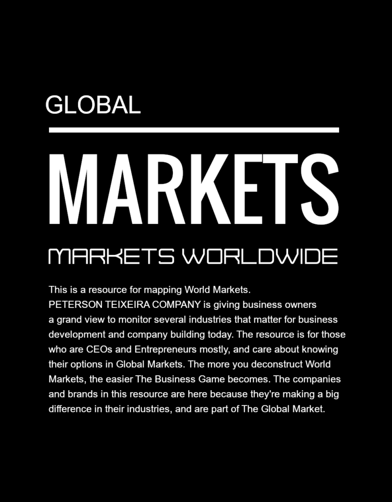 WELCOME TO GLOBAL MARKETS This is a resource created for CEOs and Entrepreneurs. The Global Markets section is a gathering and compilation of MANY industries that help you connect the dots between industries and map The International Market of a particular Industry, giving you a broader vision of everything in business today. The goal is to show all main companies in their industries and the businesses that define these industries. That’s something that executives and entrepreneurs need to know about in order to make the best business decisions in this crazy marketplace that changes every single day. Almost all information you’re about to see is strongly interconnected, giving you many business insights and warnings, because it’s curated by PETERSON TEIXEIRA COMPANY, an International Consulting Business. The wider view of the market takes a lot more work, but once this level is achieved, it’s easier to predict to where the market is going, and what you should do next. These are the core industries you can currently learn more about: